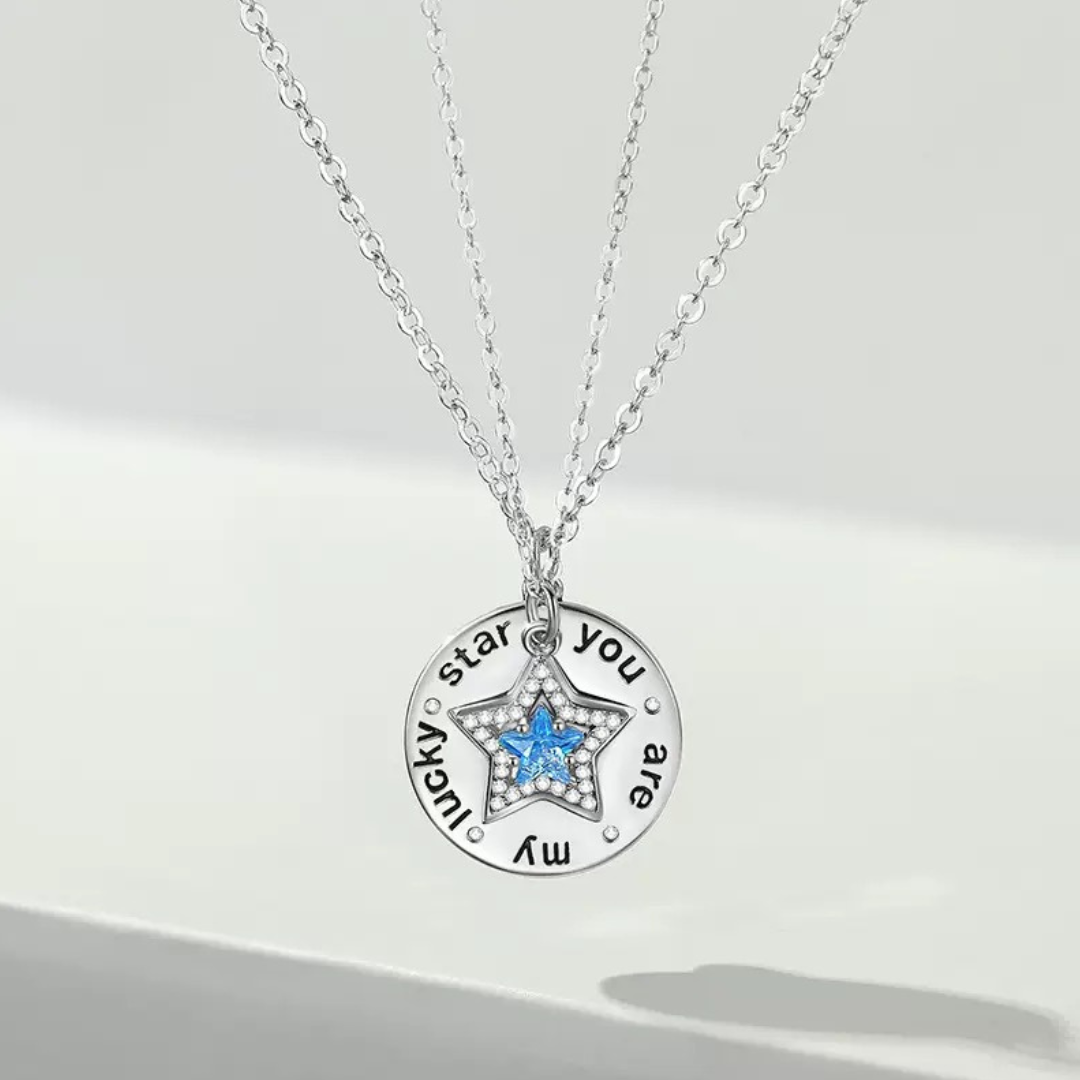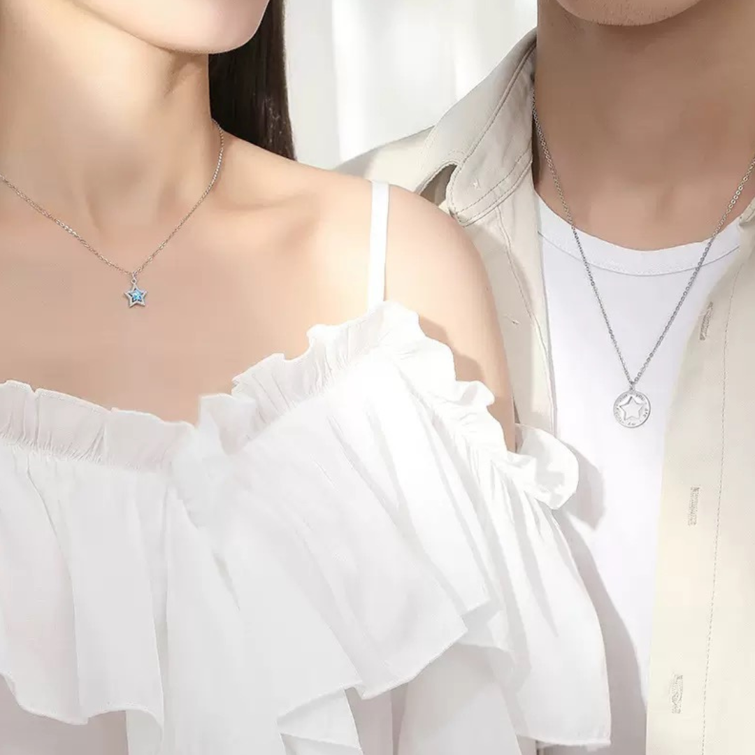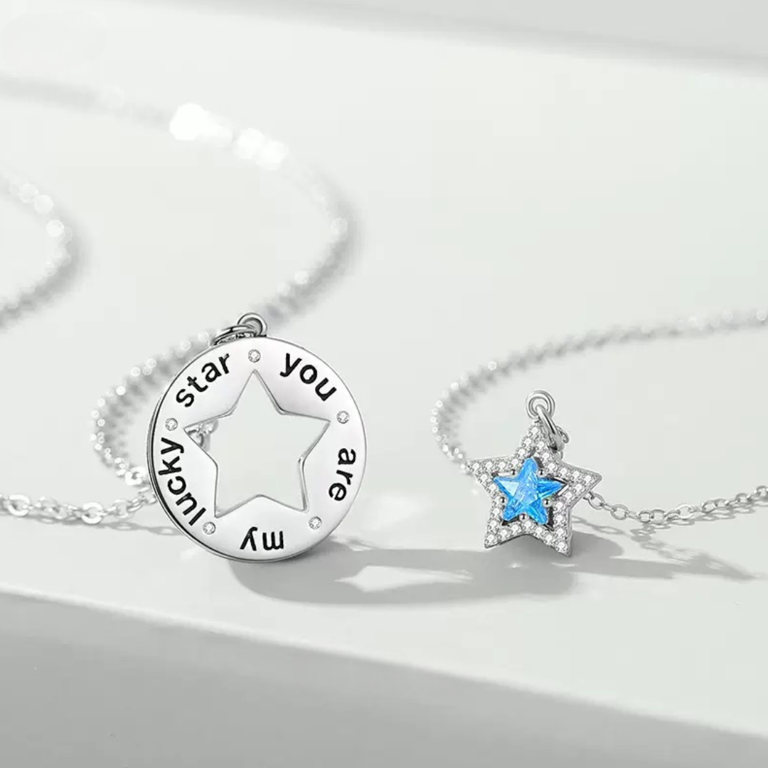 どんな夜空よりも、あなたに出会えたことが私の奇跡。青く輝く星は、日常にそっと幸運を灯し、どんな時も心の中で輝き続けます。ふたりのペンダントは重なり合うことでひとつとなり、「あなたは私のラッキースター」という想いを永遠に刻みます。記念日にも、何気ない毎日にも寄り添う、特別な証です。