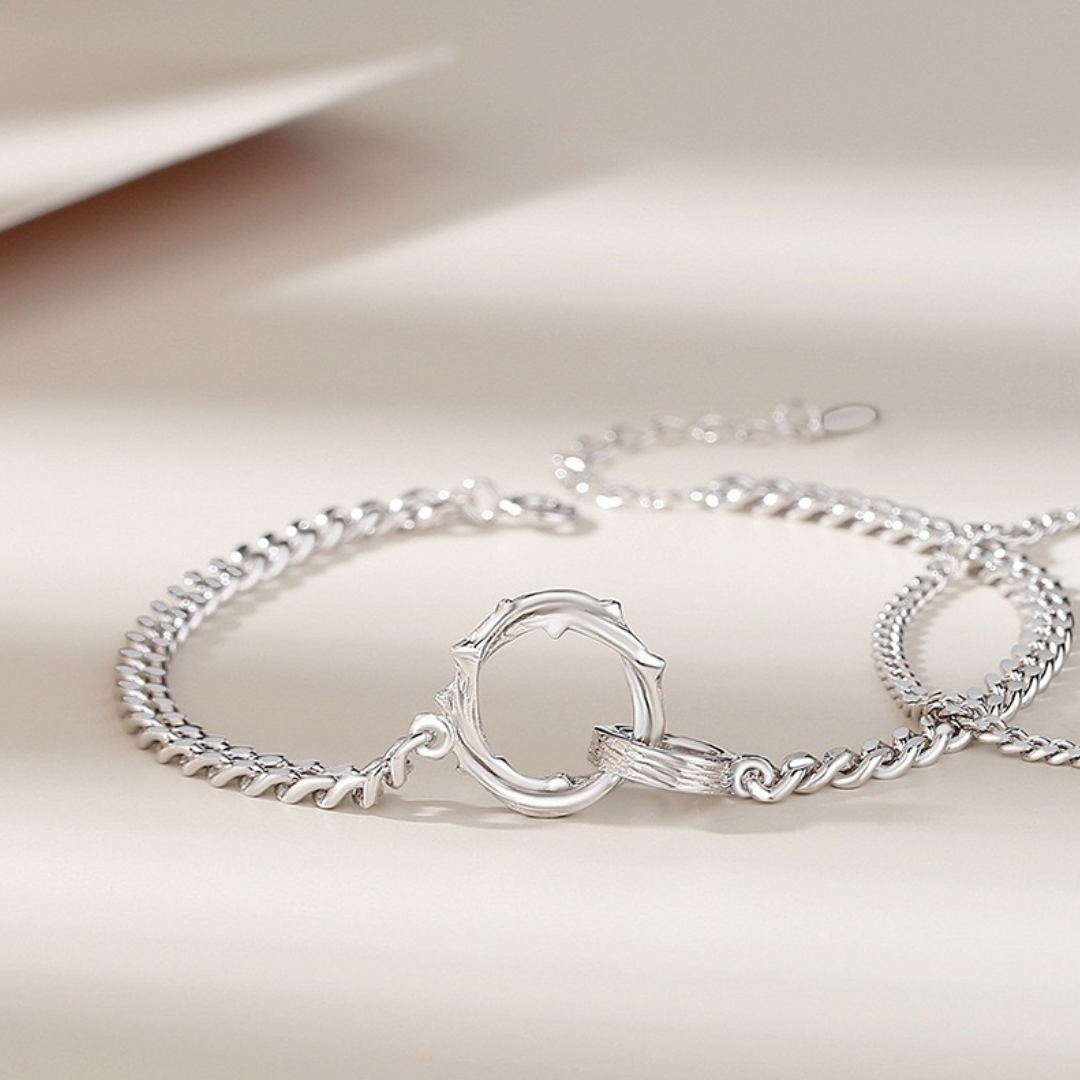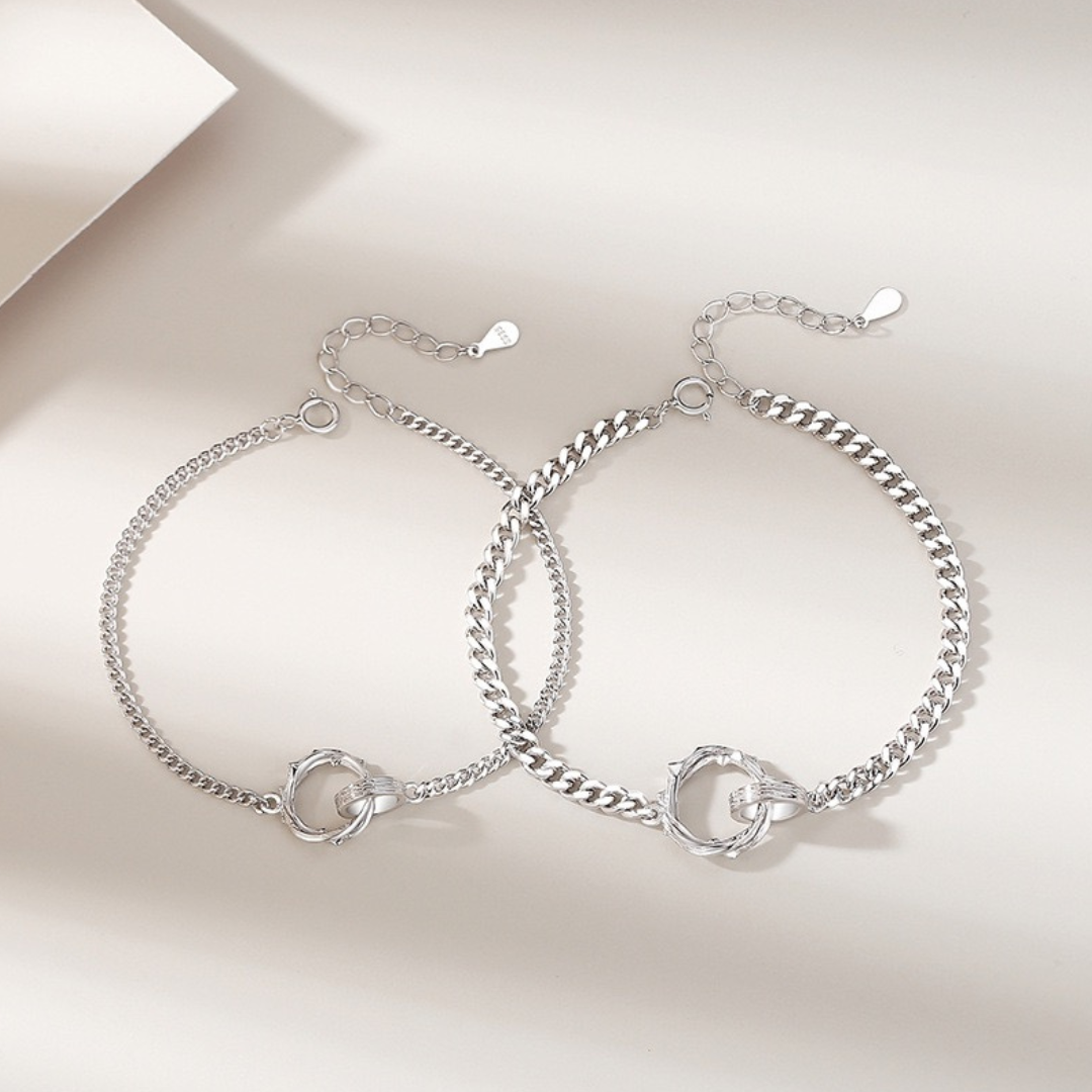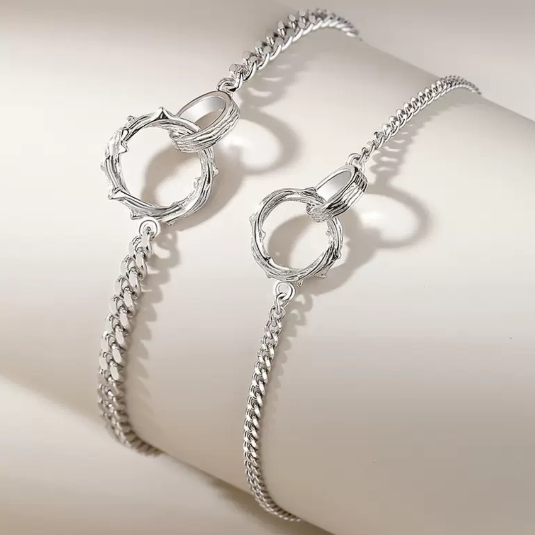 荊棘に囲まれた輪は、痛みを恐れず選んだ愛の証。困難の先に輝く絆を、このデザインが静かに語りかける。触れれば少し切ないけれど、そこに宿る強さと優しさがふたりを結び続ける。手首に光るたび、「どんな時も共に」という想いを確かめ合える。
