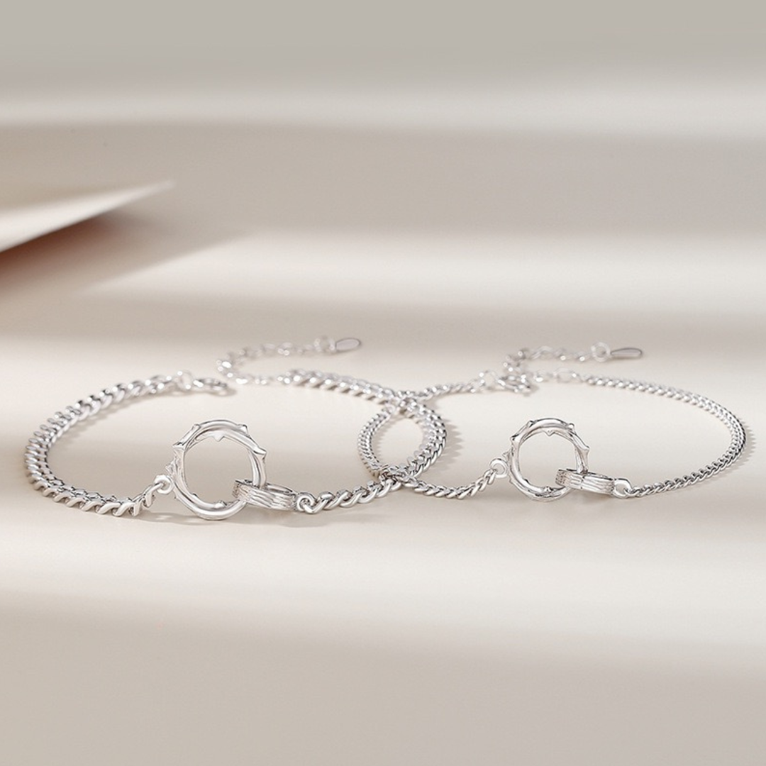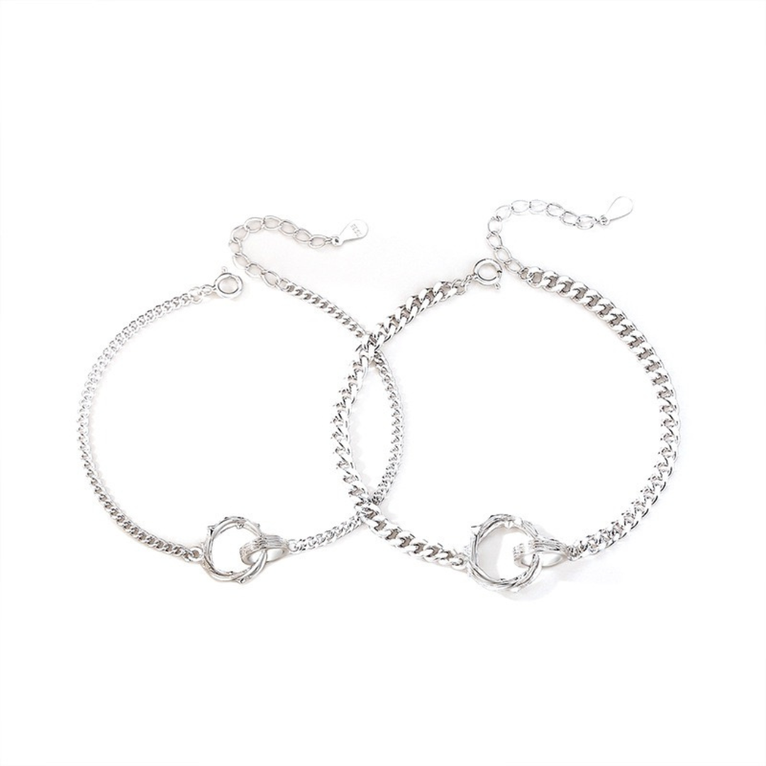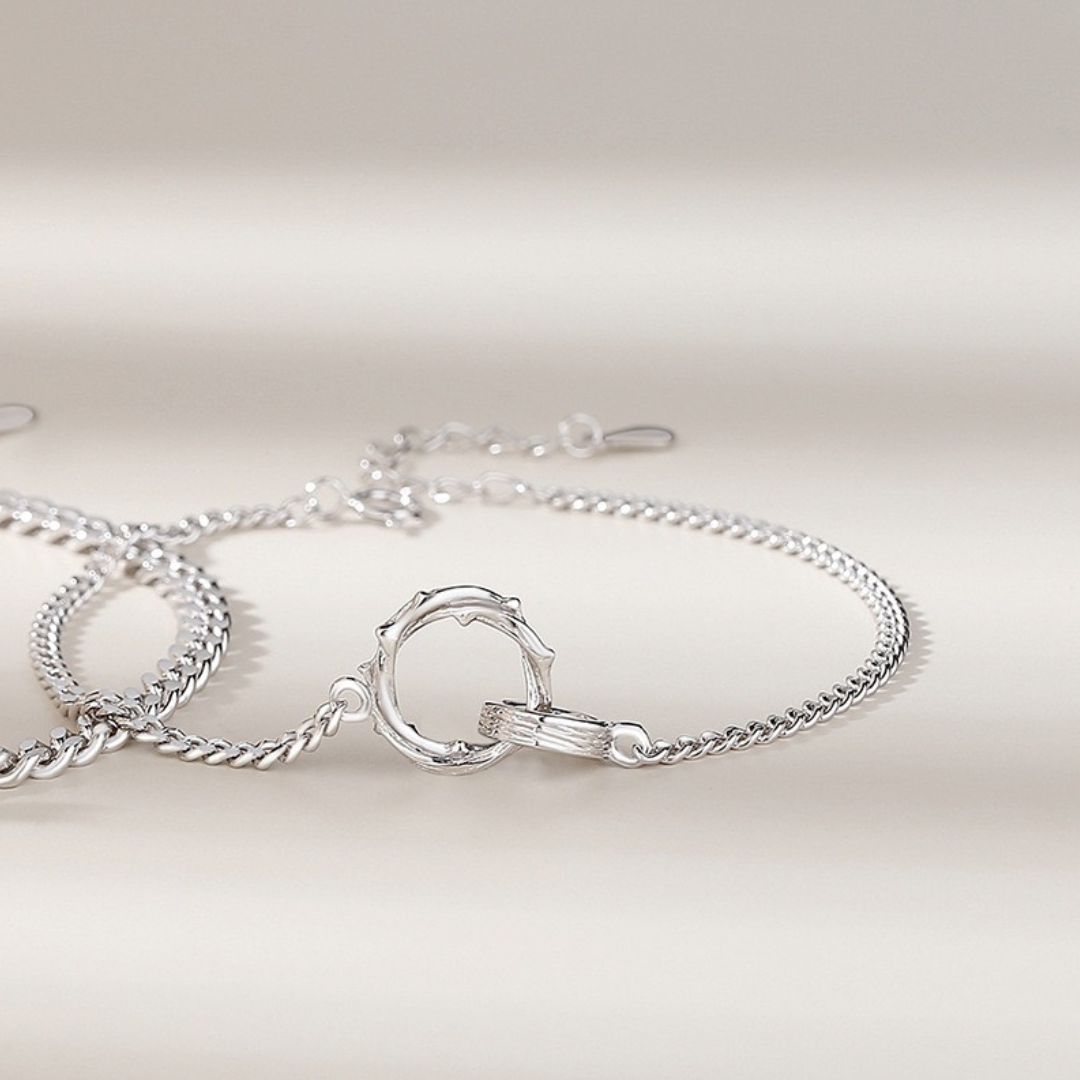 荊棘に囲まれた輪は、痛みを恐れず選んだ愛の証。困難の先に輝く絆を、このデザインが静かに語りかける。触れれば少し切ないけれど、そこに宿る強さと優しさがふたりを結び続ける。手首に光るたび、「どんな時も共に」という想いを確かめ合える。