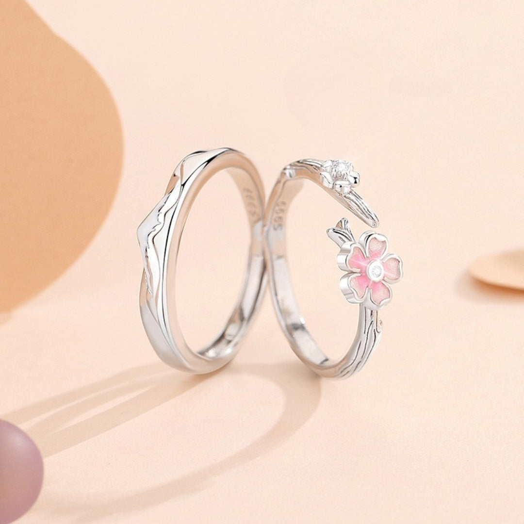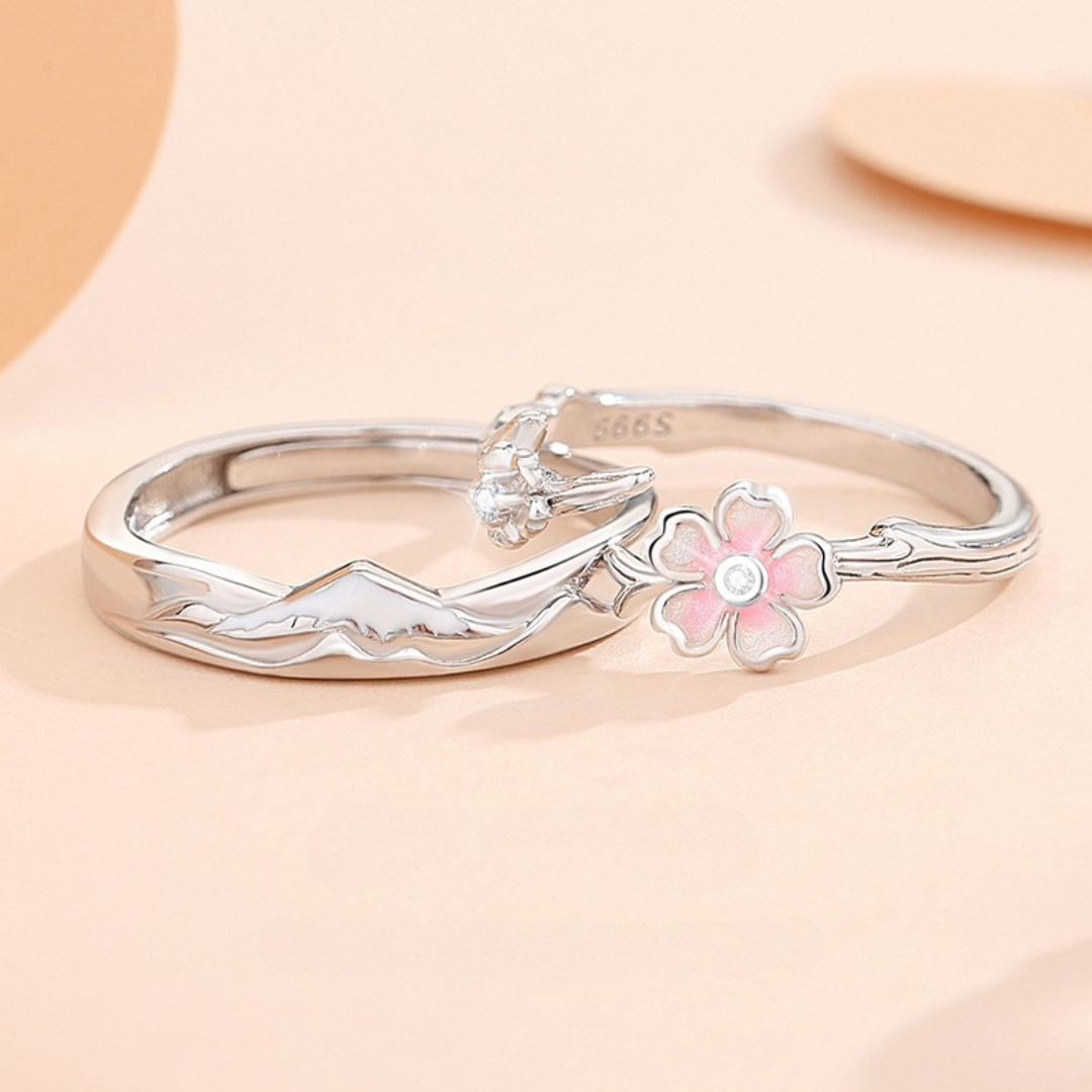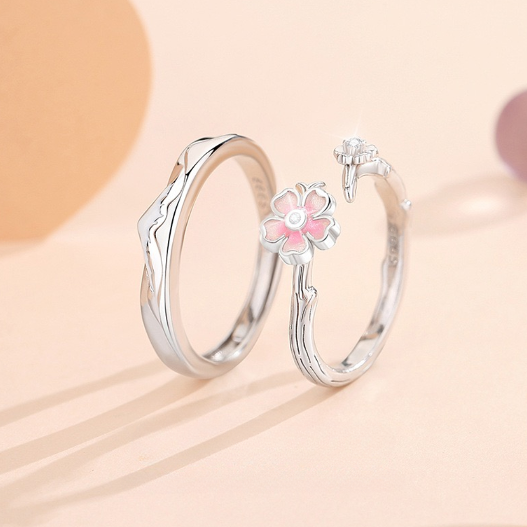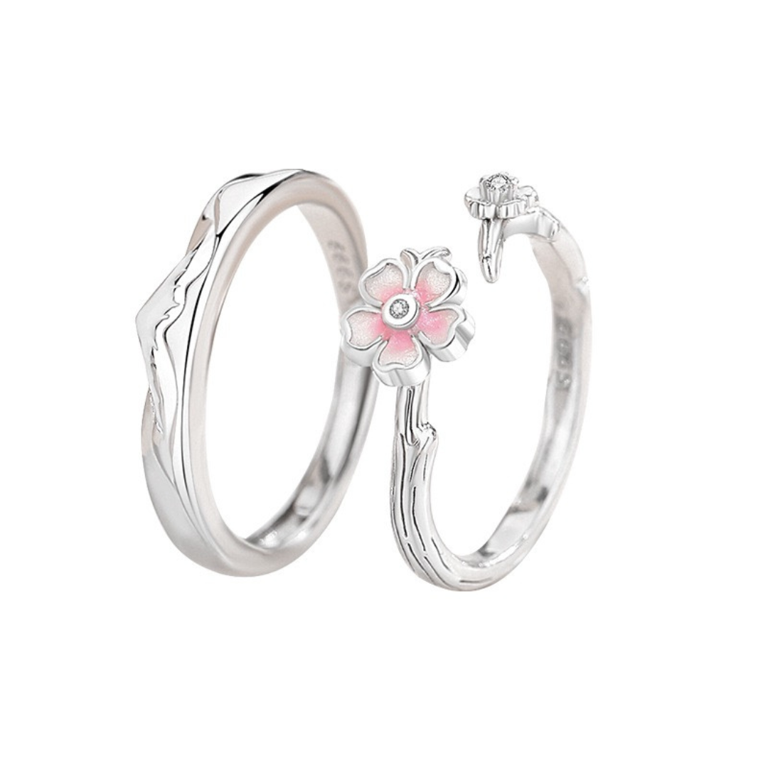 富士山の稜線と桜の花びらが重なり合い、ふたりの物語を映し出すデザイン。春風に舞う桜のように、出会った日のときめきと、変わらぬ愛をそっと刻みます。銀の清らかな輝きに淡い桜色が寄り添い、未来を照らす永遠の光となります。
