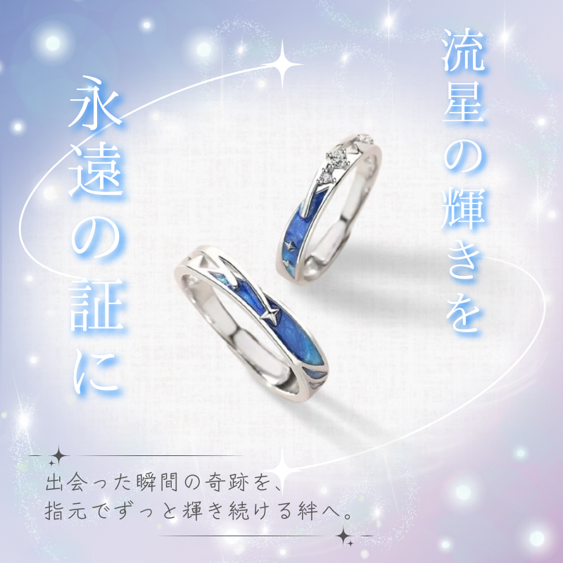流れ星のように一瞬の輝きでも、ふたりで見上げた夜空は永遠に心に残る。願いを込めた光の軌跡は、出会いの奇跡を映し出し、ふたりの絆をそっと結びます。このリングは、流星の儚さと愛の確かさを重ねた、特別な証です。